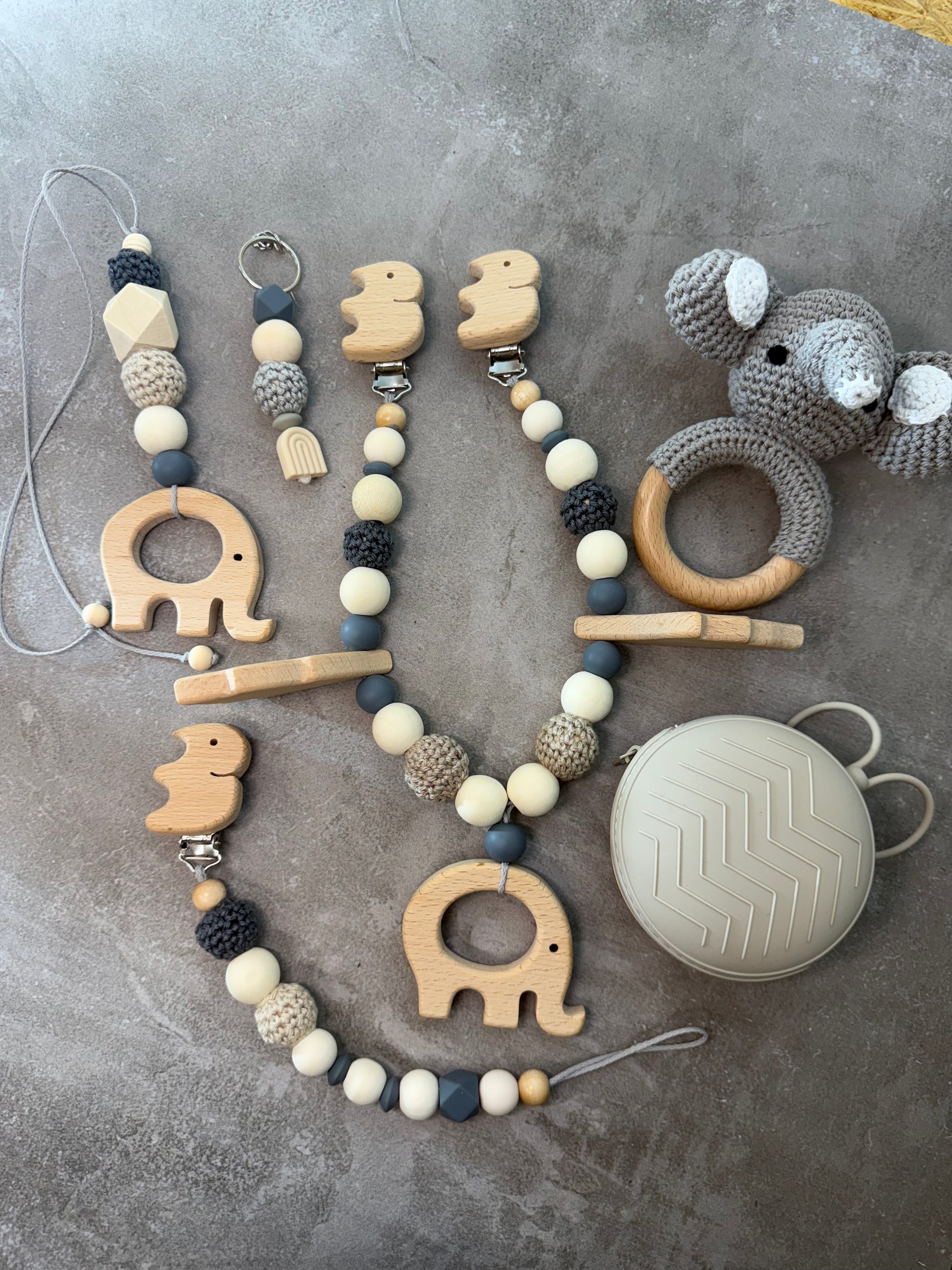 Schnullerkette, Babyrassel Elefant, Schnullerbox,